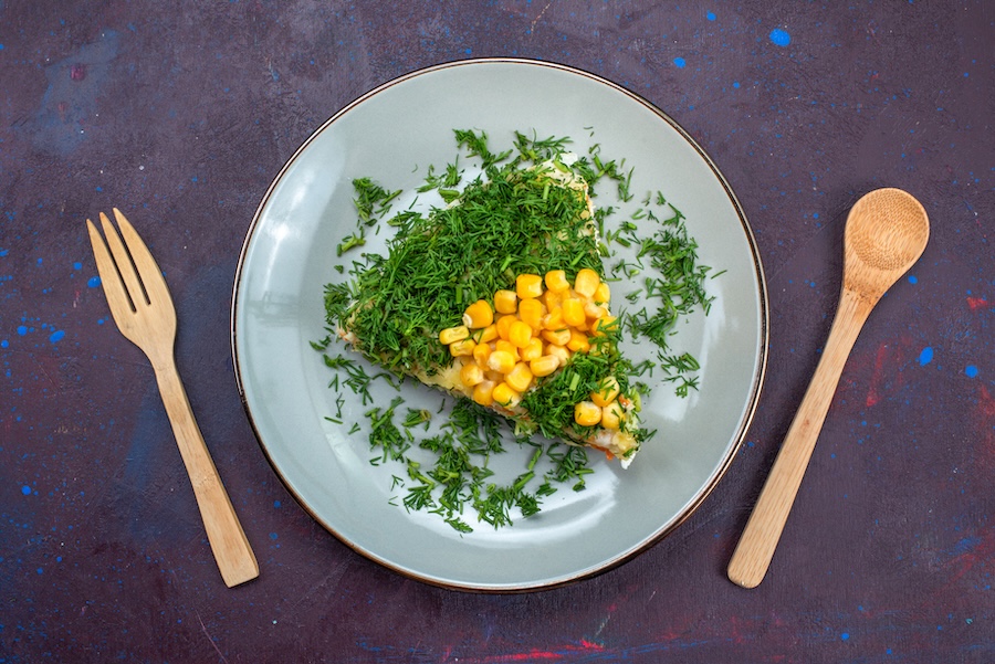 - Теперь натирайте яйца и тоже укладывайте их в миску. Для эстетики можно разделить белки и желтки (последние распределяются сверху салата). Для украшения можно использовать зелень.
