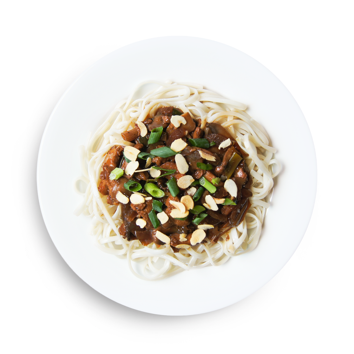 удон (макаронные изделия, вода, масло подсолнечное, масло кунжутное, соль), цыпленок с грибами в соусе хойсин (бедро куриное с/м, шампиньоны св., лук репчатый св., соус соевый, соус хойсин, лук зеленый св., соус шрирача жгучий острый, масло кунжутное, масло подсолнечное, соус соевый темный, имбирь св., чеснок св., перец ч/м), арахис, лук зеленый св.