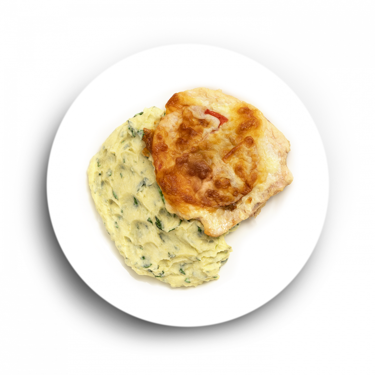 Цыпленок по-французски с картофельным пюре и шпинатом