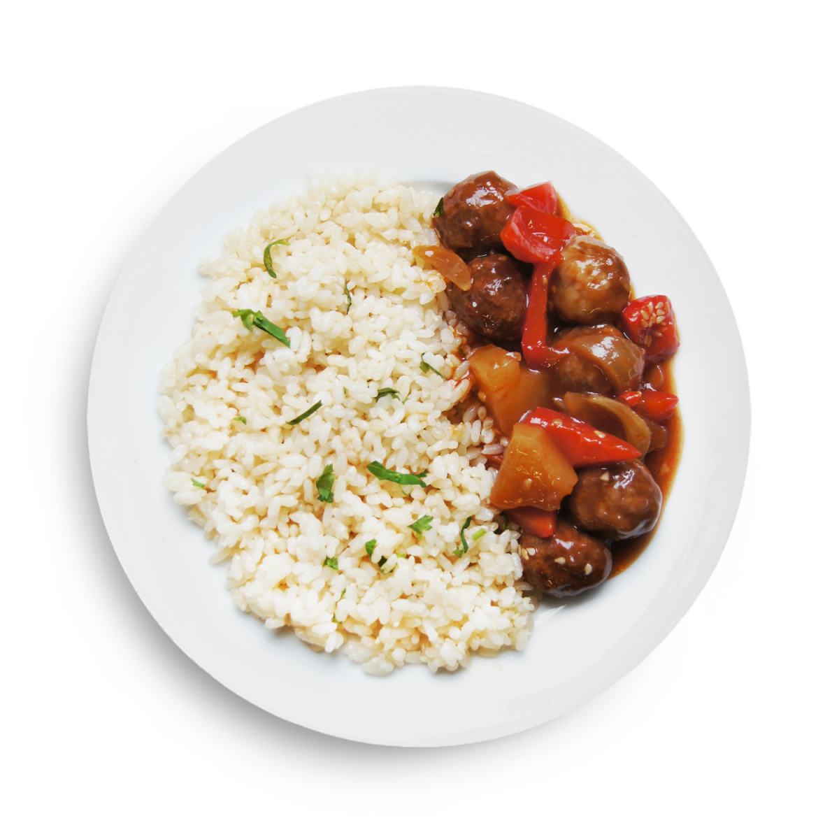 рис (крупа рис, соевый соус, масло кунжутное, вода), фрикадельки в соусе (соус (перец болгарский, лук репчатый, ананас конс., масло подсолнечное, крахмал кукурузный, имбирь св., чеснок св., бульон куриный, кетчуп, сахар, сок ананаса, соевый соус, уксус рисовый темный, томатная паста, соус шрирача), фрикадельки (говядина с/м, лук репчатый св., сухари панировочные, яйцо куриное,хлеб батон, соль, перец ч/м, чеснок суш., масло подсолнечное)), кунжут белый, зелень кинзы св.