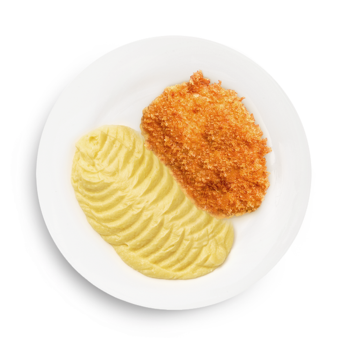 картофельное пюре (картофель, молоко, сливочное масло, сливки, соль), ромштекс (свинина, сухари панировочные Панко, масло подсолнечное, меланж, мука, перец ч/м, соль).