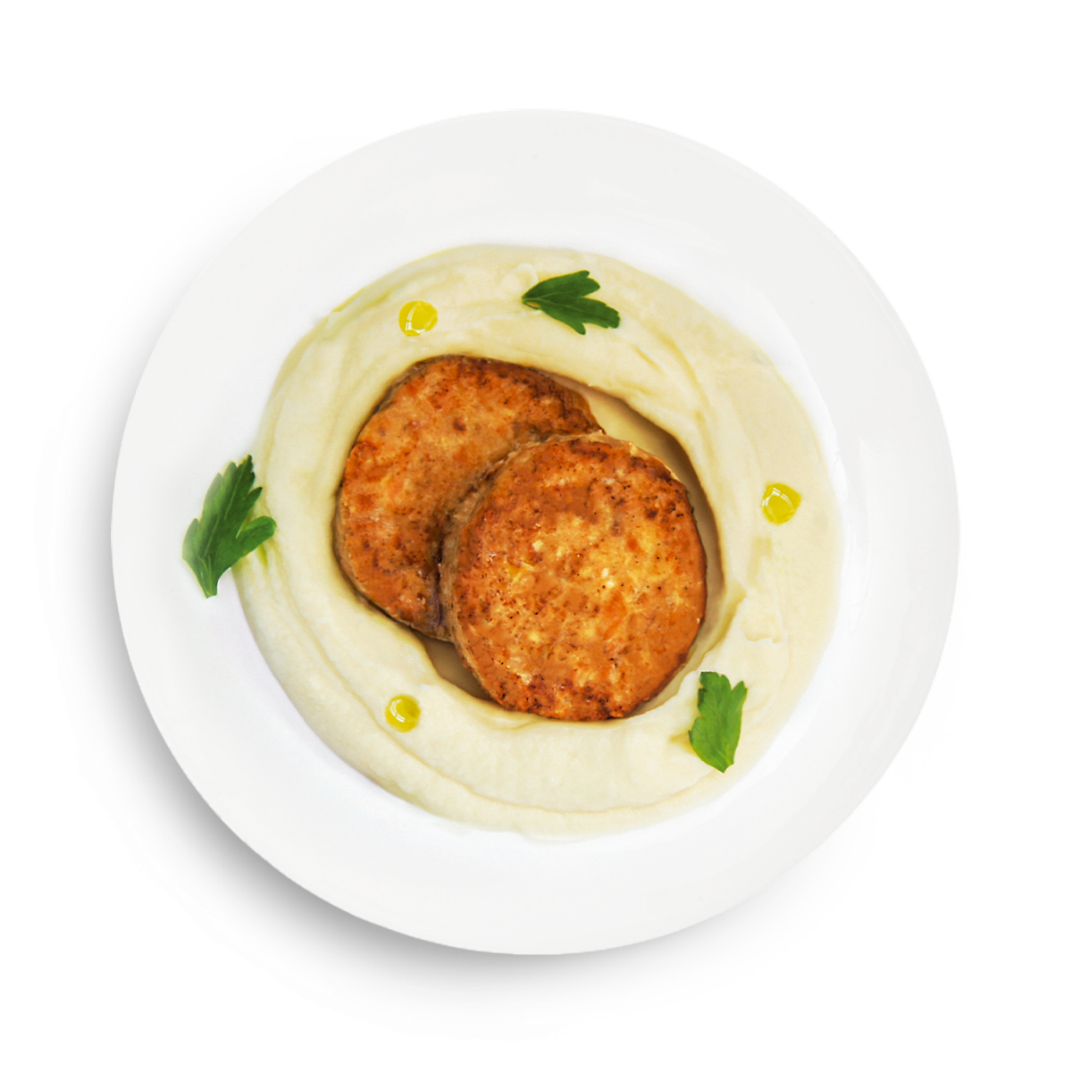 пюре из цветной капусты (капуста цветная с/м, вода, масло сливочное м.д.ж. 82,5%, соль), котлеты (филе сайды с/м, филе горбуши с/м, лук репчатый св., яйцо куриное, соль, перец ч/м, масло подсолнечное), зелень петрушки св.