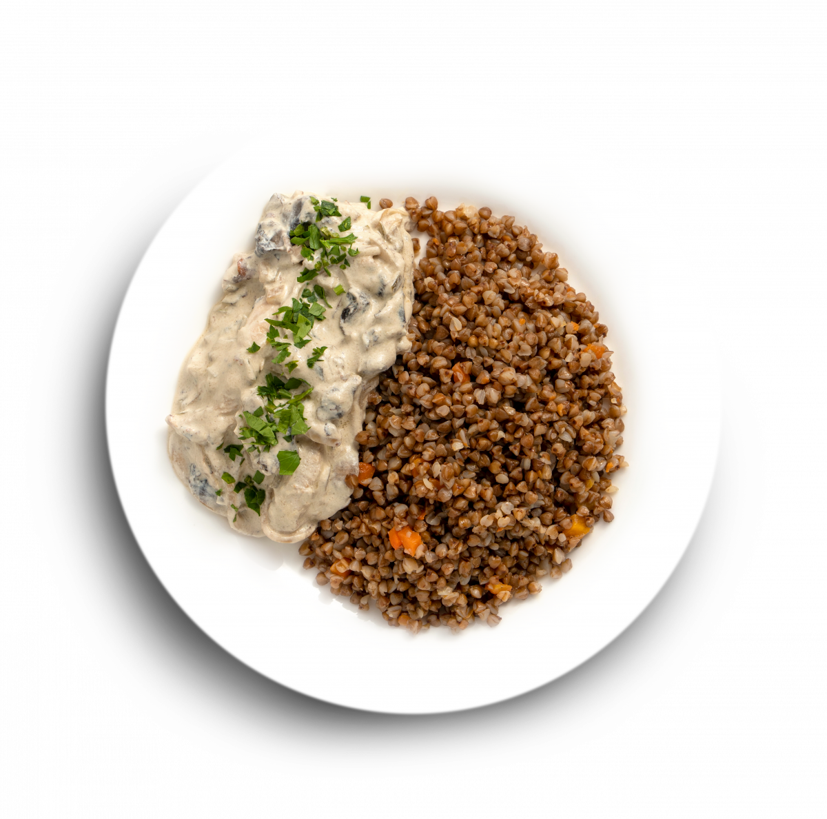 Цыпленок по-строгановски (филе куриное, молоко, сливки, лук репчатый, вешенки, огурцы соленые, сливочное масло, мука, масло подсолнечное, горчица ротисьер, соус устричный), гречка (крупа гречневая, лук репчатый, морковь, масло подсолнечное, соль), петрушка.
