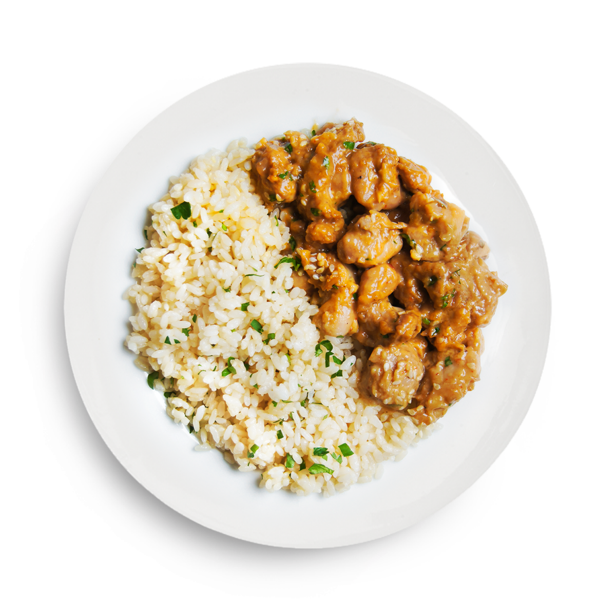 рис (крупа рис, уксус мицукан, соевый соус, масло кунжутное, вода, кунжут, сахар, соль), цыпленок в соусе (бедро куриное с/м, мед, вода, соус соевый, масло оливковое, крахмал кукурузный, уксус рисовый темный, специи лук сушеный, чеснок св., петрушка св., соль, специи паприка сл., специи перец ч/м), кунжут, петрушка св..