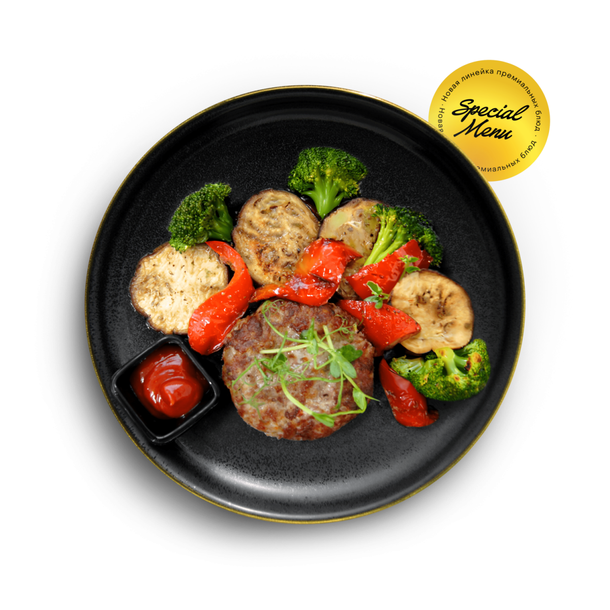 бифштекс (свинина лопатка с/м, говядина лопатка с/м, сыр моцарелла, сливки 22%, соль, перец ч/м, масло подсолнечное), брокколи запеч. (брокколи с/м, масло подсолнечное, соль, специи итальянские травы, перец ч/м), баклажаны запеч. (баклажаы св., масло подсолнечное, чеснок св., соль, специи тимьян молот.), соус BBQ (кетчуп, сахар, бекон с/к, сок апельсиновый, соус барбекю, лук репчатый св., вода, крахмал картофельный, соус шрирача, соль), перец болгарский (перец болгарский св., масло подсолнечное).