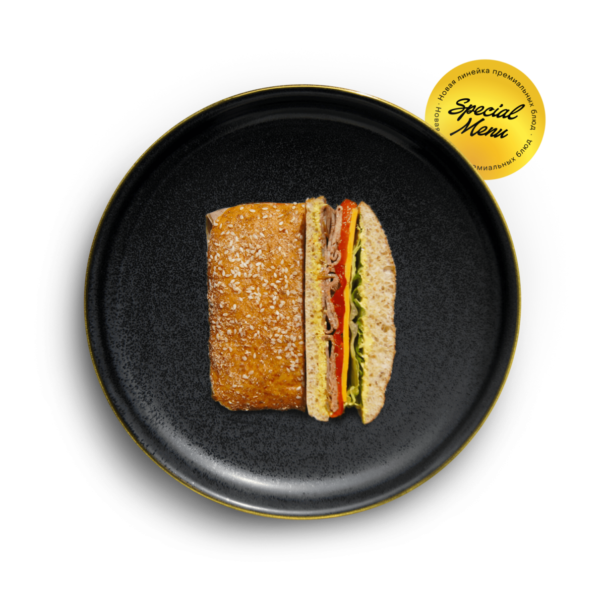булка с отрубями (мука пшеничная, молоко 3,2%, яйцо куриное, отруби пшеничные, масло сливочное м.д.ж. 82,5%, сахар, дрожжи св., соль, кунжут белый) ростбиф (говядина с/м, масло подсол., соль, чеснок св., специи: розмарин, тимьян, перец ч/м), перец запеч. (перец болг. св., масло подсол., чеснок св., специи: паприка, орегано), соус карри (майонез м.д.ж. 67%, паста карри, соус фиш, сок лимона св., чеснок очищ., специи карри), сыр Чеддер, листья салата св., соус шрирача.