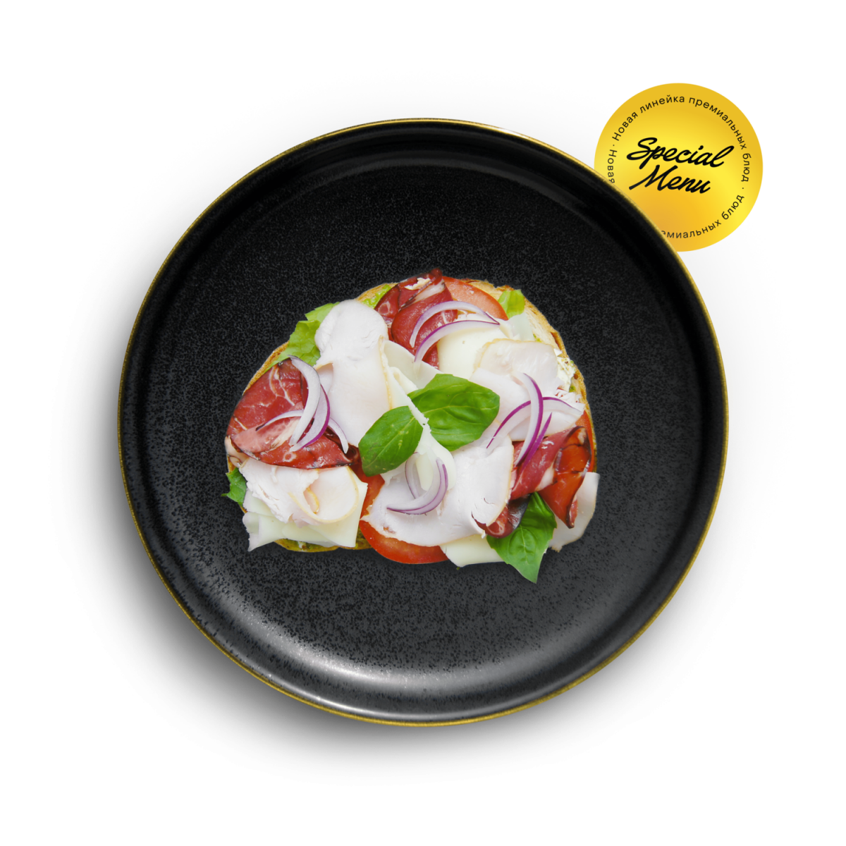 помидоры св., сыр Моцарелла, хлеб (мука пшеничная, вода, солодовый экстракт, соль, солодовый улучшитель, дрожжи свежие), кортадор шейка с/в из свинины, индейка копч., сыр творожный с зеленью, листья салата св., соус песто (подсол. масло, петрушка св., базилик св., горчица, орех кешью, сыр Пармезан, концентрат лимона, соль, сахар, чеснок св.), лук красный св., зелень базилика св.