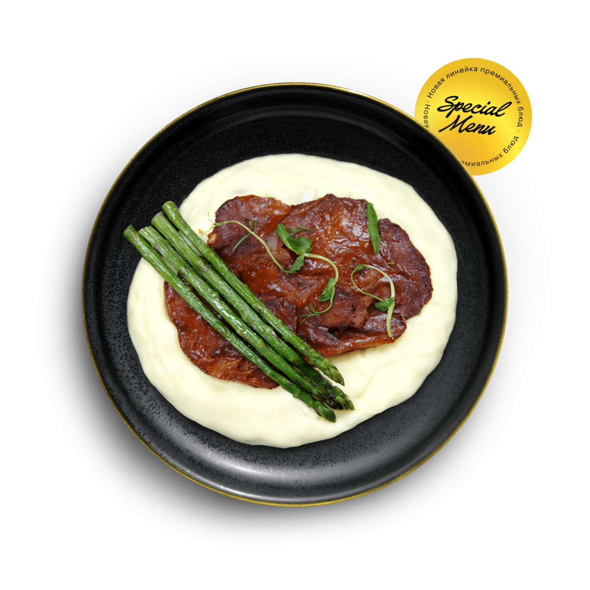 картофельное пюре (картофель, молоко 3,2%, сливочное масло 82,5%, сливки 22%, соль), телячьи щечки (телячьи щечки с/м, масло подсолнечное, томатная паста, шампьньоны св., сельдерей св., лук порей св., морковь св., перец болгарский св., уксус винный, соль, чеснок св., укроп св., тимьян св., перец ч/м), соус демиглас, спаржа (спаржа зеленая с/м, соль, вода), специи перец розовый.