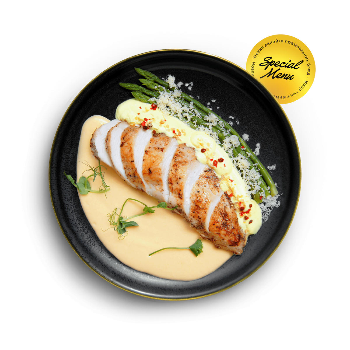 цыпленок гриль (филе куриное с/м, масло подсолнечное, чеснок св., специи итальянские травы, соль) пюре из сельдерея (сельдерей св., сливки 22%, морковь св., масло сливочное 82,5%, соль), соус Шафран (сливки 22%, лук репчатый св., масло сливочное 82,5%, соль, специи куркума), спаржа (спаржа зеленая с/м, соль, вода), сыр Пармезан, микрозелень горох, специи перец розовый, лук фри.