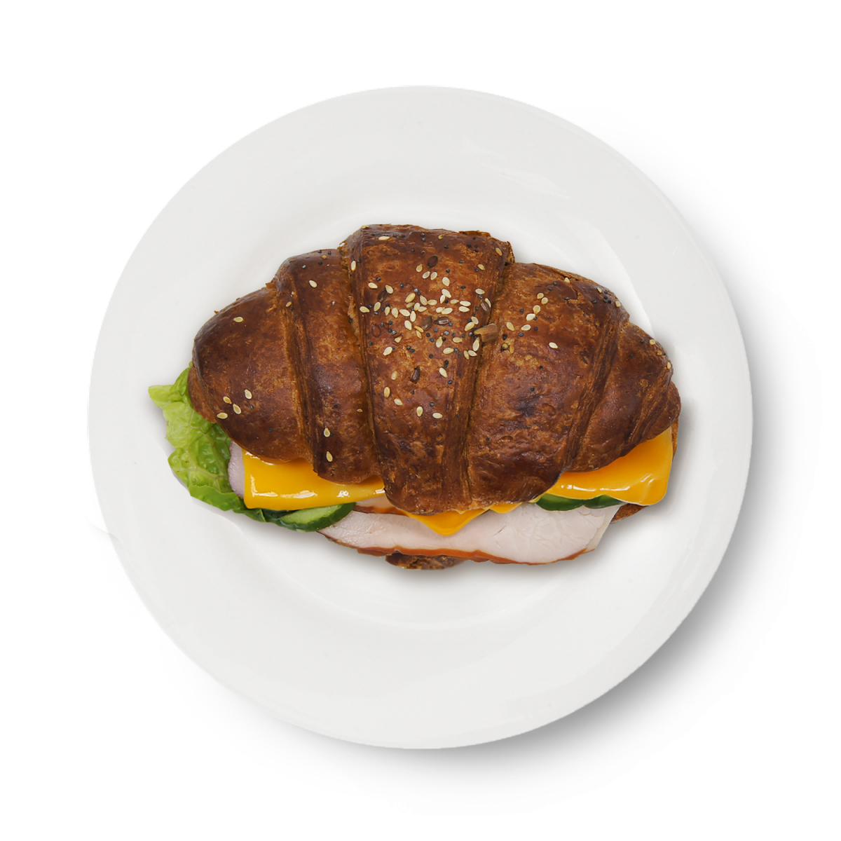 круассан злаковый (мука пшеничная, молоко м.д.ж. 3,2%, вода, масло сливочное м.д.ж. 82,5%, яйцо куриное, сахар, дрожжи св., улучшитель, соль, солодовый экстракт, семена:мака, подсолнечника,кунжут белый), свинина окорок копчено-вареный, соус горчичный ( майонез м.д.ж. 67%, горчица), помидоры св., сыр чеддер, огурцы св., листья салата св.